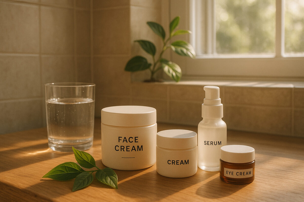 Photo hyperrealiste d'une scene de bain naturelle avec crèmes visage sur un comptoir en bois